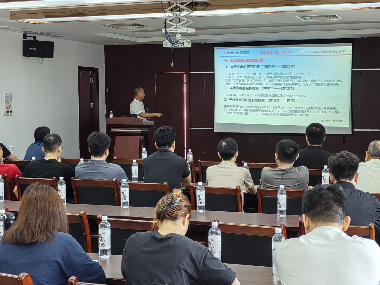 隨后,對專(zhuān)為光伏行業(yè)所研發(fā)的富能光伏一體瓦等新型產(chǎn)品進(jìn)行一系列的科普講解。讓各部門(mén)同事進(jìn)一步掌握到新產(chǎn)品的工藝和性能。