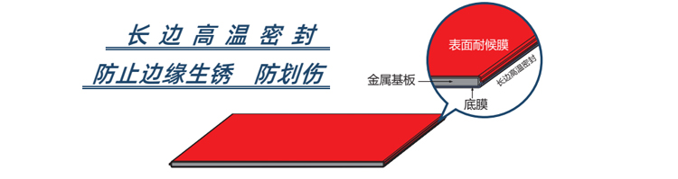底層采用耐腐蝕的專(zhuān)用鋼板膜且表面膜和底膜在長(cháng)邊方向緊密密封,避免板材長(cháng)度方向生銹腐蝕,同時(shí)也可以避免在使用時(shí)劃傷手。