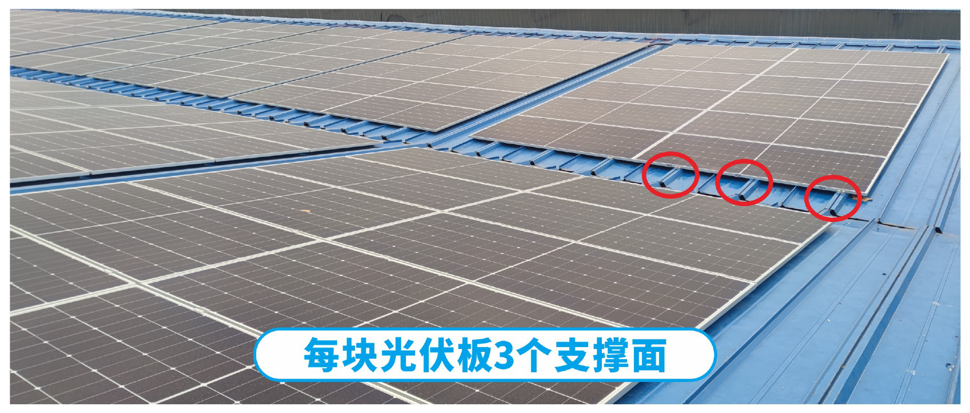 (4)特殊的“燕尾槽”設計,剛性更大,與光伏板支撐面更大,每塊光伏板有3個(gè)“燕尾槽”支撐,光伏板完全沒(méi)有變形風(fēng)險,每三塊瓦安裝一塊光伏板,屋面可以達到滿(mǎn)鋪光伏板。